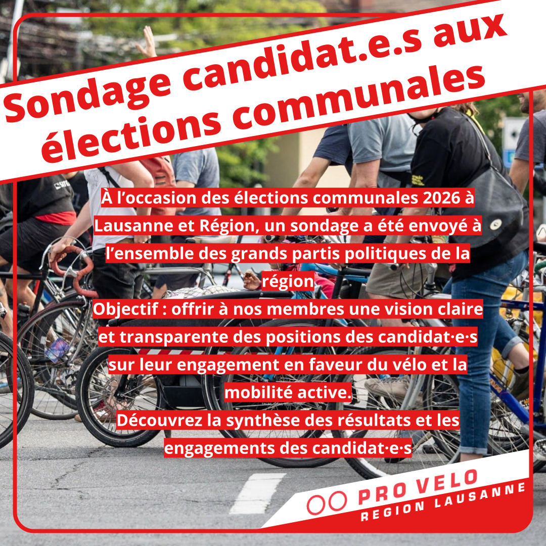 Dans le cadre des élections communales 2026 à Lausanne et dans les communes environnantes, notre association a souhaité interroger les candidat·e·s sur leur engagement en faveur du vélo et des mobilités actives. Le sondage a été transmis à l’ensemble des grands partis politiques de la région, afin de garantir une démarche ouverte, pluraliste et transparente.