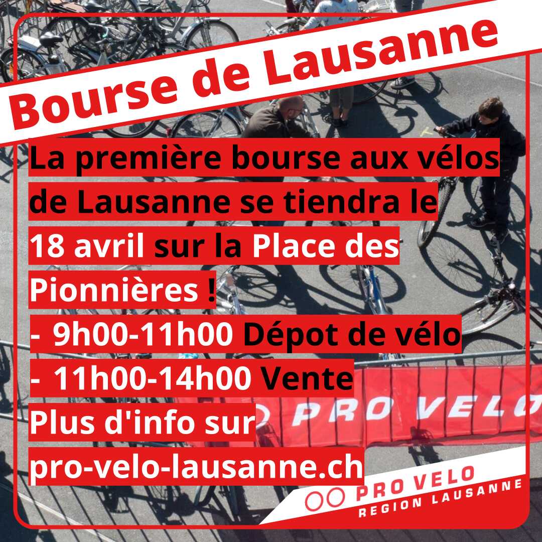 Le samedi 18 avril 2026 aura lieu la bourse aux vélos à Lausanne, sur la Place des Pionnières.